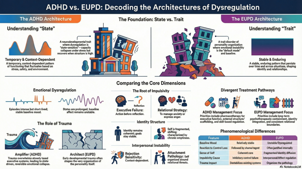 In contrast to ADHD, emotional dysregulation in EUPD is not episodic—it is baseline.