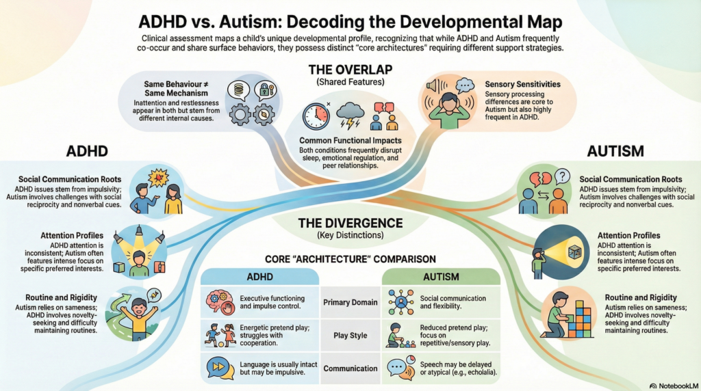 ADHD and autism often co-occur, frequently overlap in surface behaviours, and can mask each other. A good assessment separates what the child can’t do yet from what the child won’t do from what the environment is making harder than it needs to be.